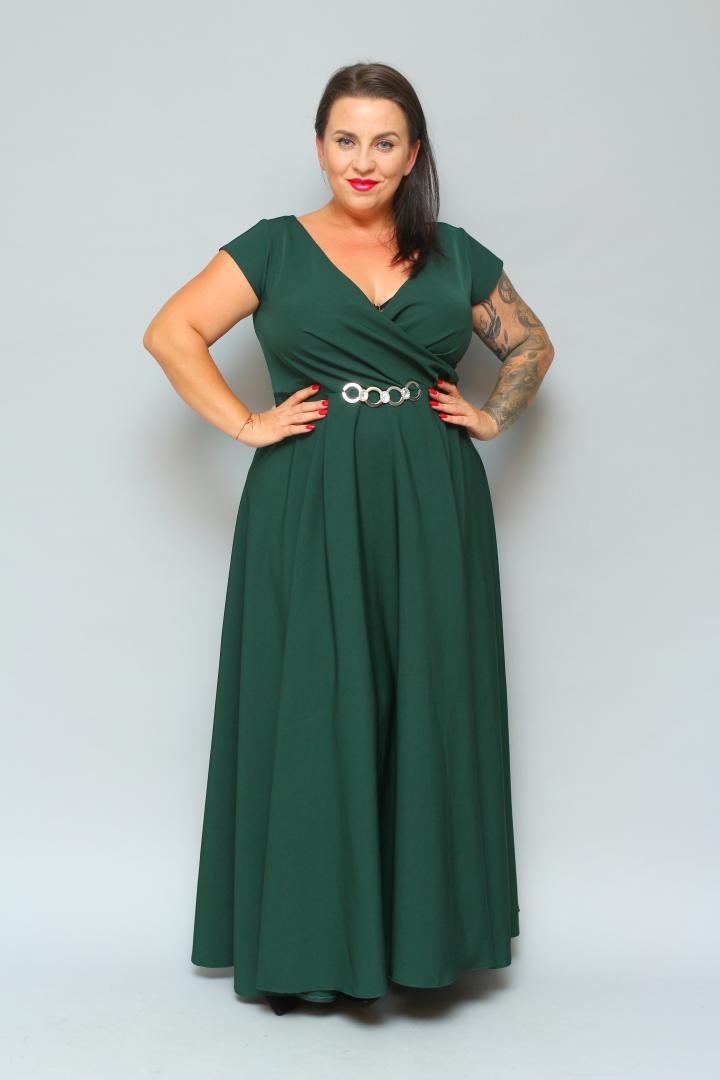 Sukienka wieczorowa Camilia – rozkloszowany krój, kopertowy dekolt, szykowna klamra. Zobacz film, który pokazuje, jak pięknie się układa! BUTELKOWA ZIELEŃ