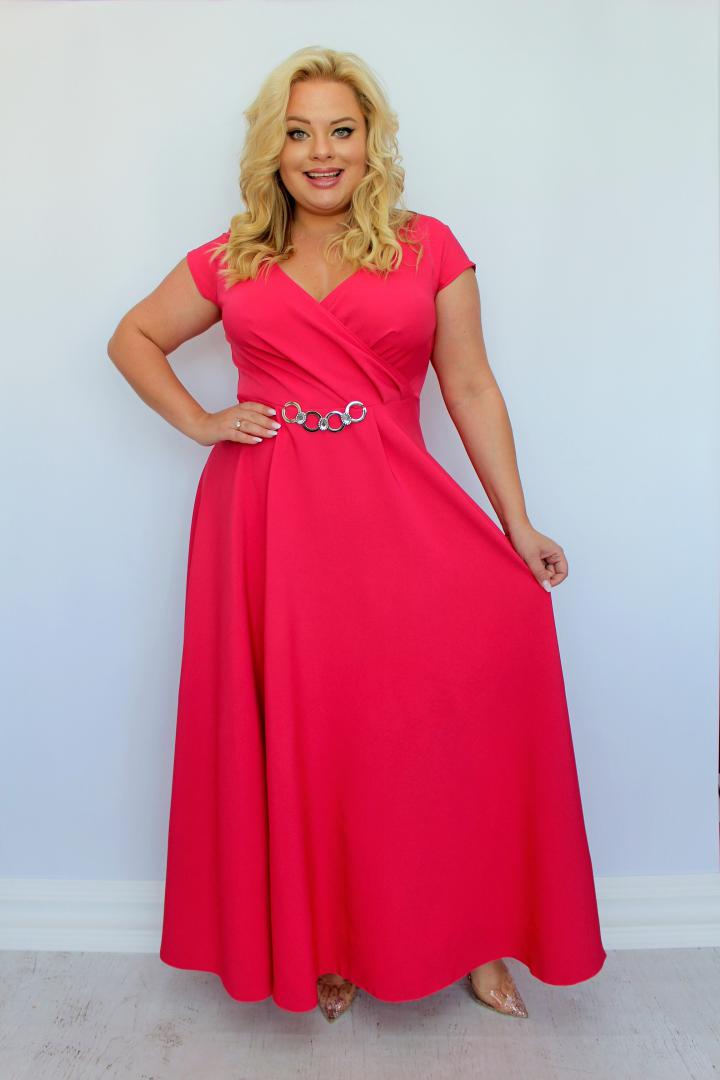 Sukienka wieczorowa Camilia – rozkloszowany krój, kopertowy dekolt, szykowna klamra. Zobacz film, który pokazuje, jak pięknie się układa! AMARANTOWA