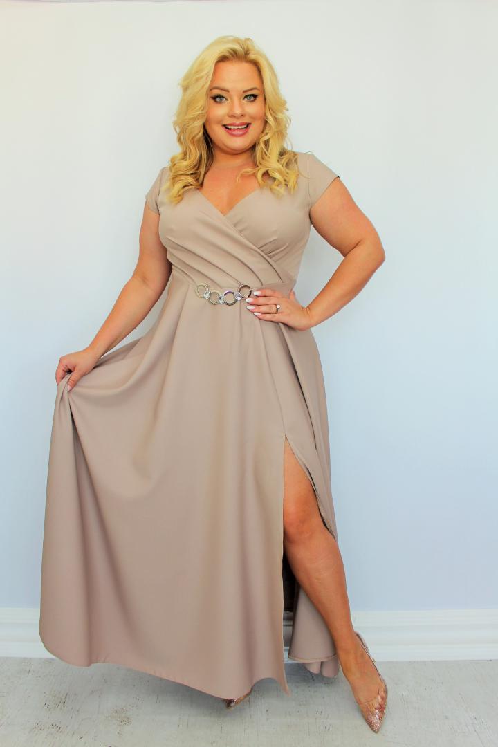 Sukienka wieczorowa Camilia – rozkloszowany krój, kopertowy dekolt, szykowna klamra. Zobacz film, który pokazuje, jak pięknie się układa! NUDE