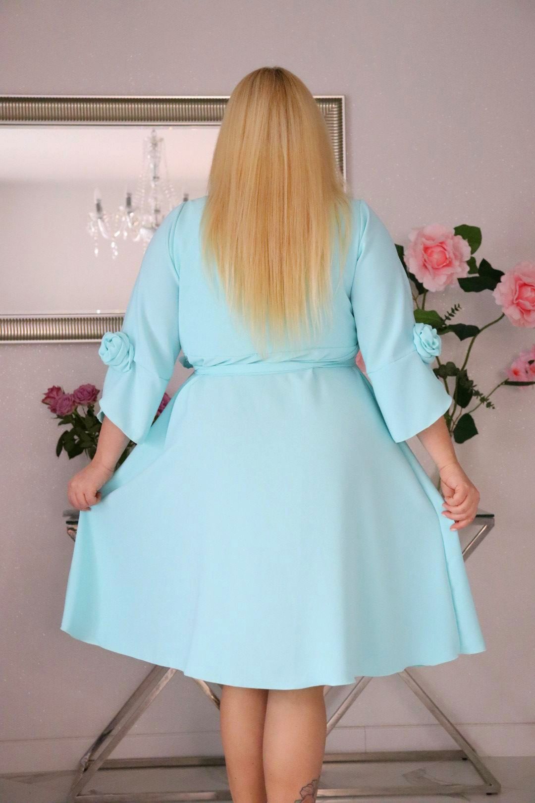 Hit sezonu: Sukienka kopertowa z trójwymiarowymi różami. Miętowa. KOD S1201.