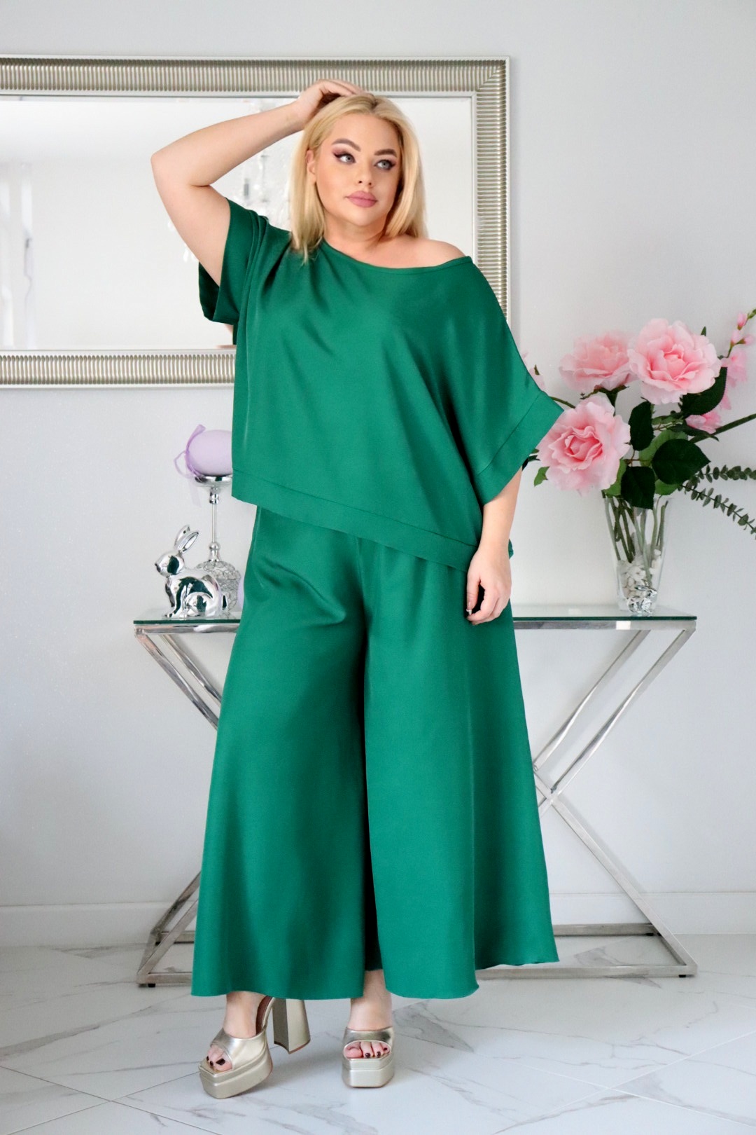 • Szerokie, zwiewne nogawki, które optycznie wydłużają sylwetkę.