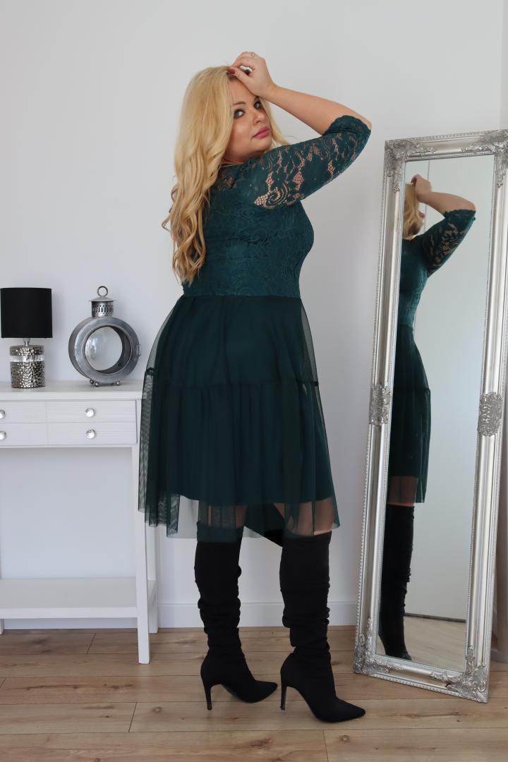 🇵🇱 Polski ProduktSukienka Adriana rozkloszowana z tiulu z kopertowym dekoltem i koronkową górą butelkowa zieleń