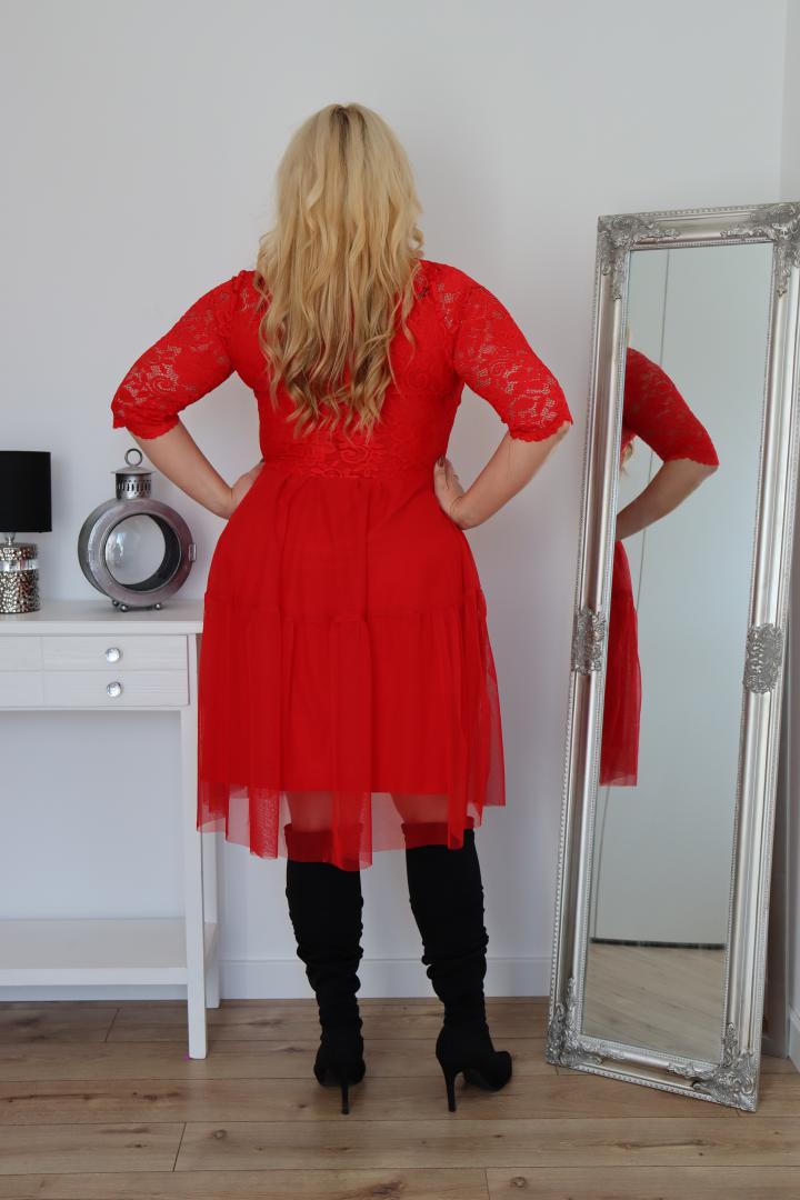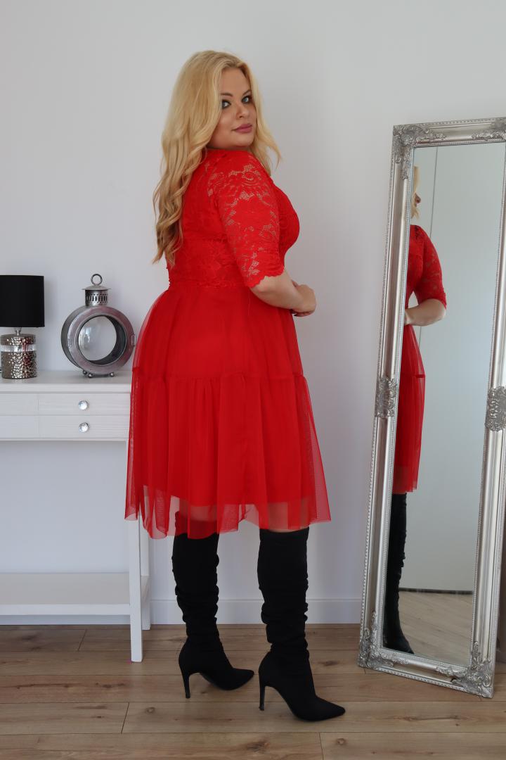 🇵🇱 Polski ProduktSukienka Adriana rozkloszowana z tiulu z kopertowym dekoltem i koronkową górą czerwona