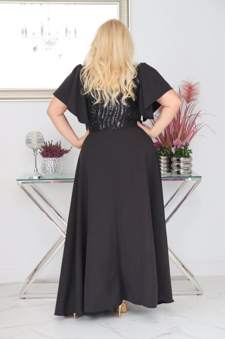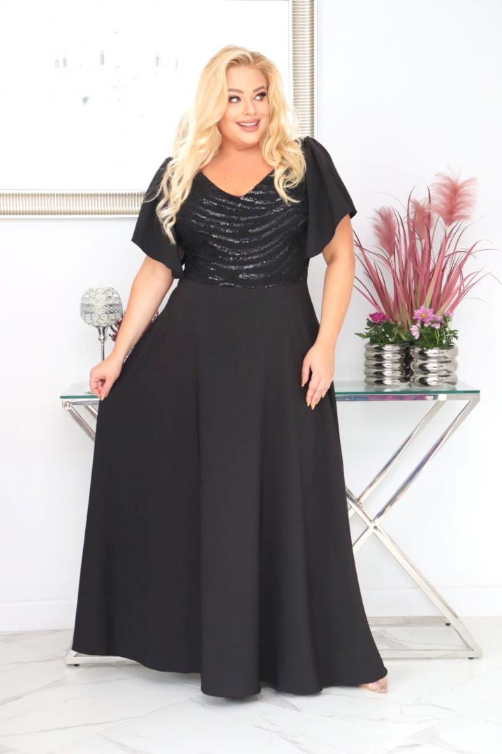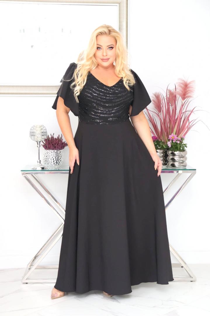 Górna część sukienki to prawdziwe dzieło sztuki. Wykonana z eleganckiej dzianiny, jest hojnie obsypana połyskującymi cekinami, które mienią się przy każdym ruchu, tworząc zjawiskowy efekt „wow”. Ten błyszczący akcent nadaje sukience ekskluzywnego charakteru, idealnego na wieczorne wyjścia. Luźne rękawy dodają całości lekkości i nonszalancji, a jednocześnie zachowują elegancki ton. Dzięki temu połączeniu, sukienka Amelia to kwintesencja luksusu i wyrafinowania, która sprawi, że nie przejdziesz niezauważona.