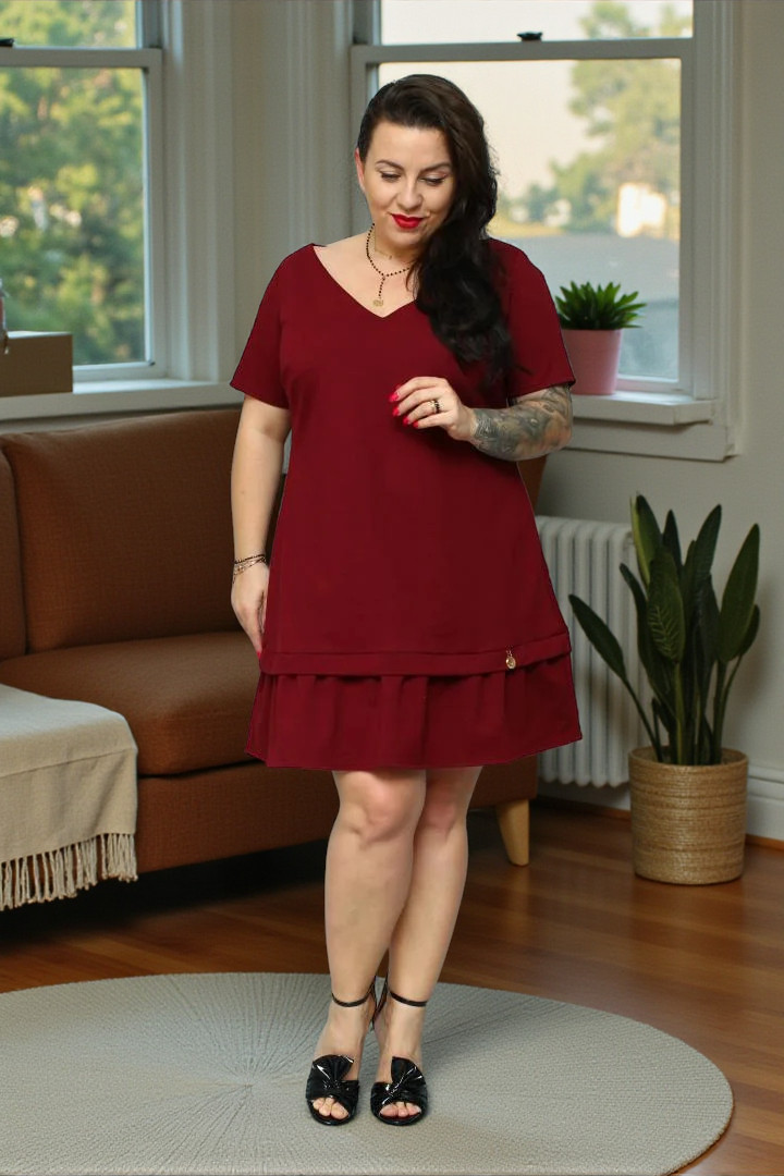 🇵🇱 Polski ProduktSukienka Anika trapezowa z falbanką 100% BAWEŁNA POLSKI DRES bordowa