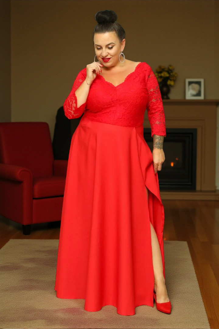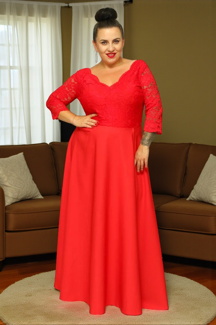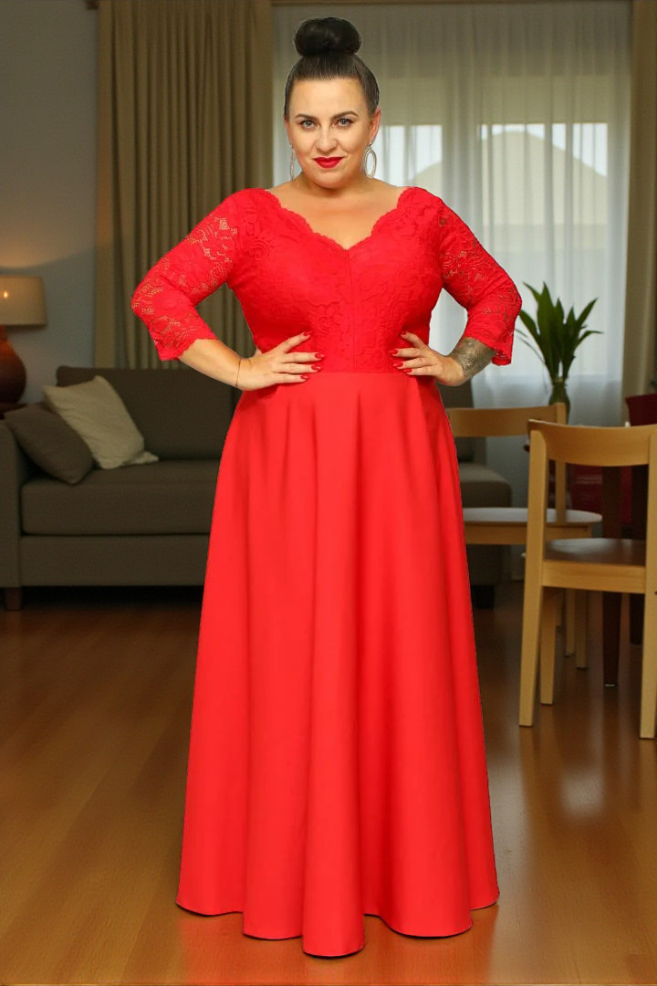 🇵🇱 Polski ProduktSukienka Caterina maxi wieczorowa rozkloszowana ekskluzywna dekolt serek czerwona koronka kwiatki