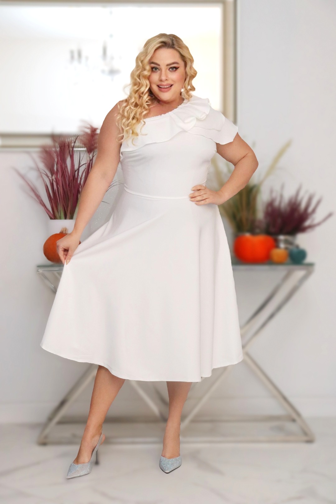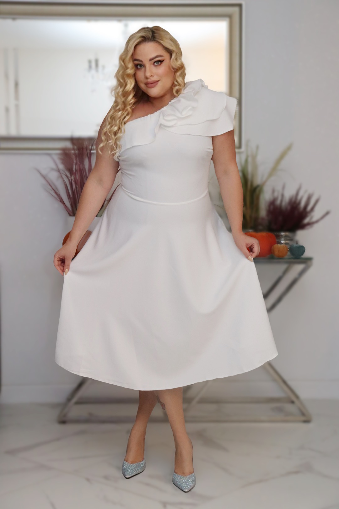 z rozkloszowanym dołem i eleganckim dekoltem z falbaną na jedno ramię.