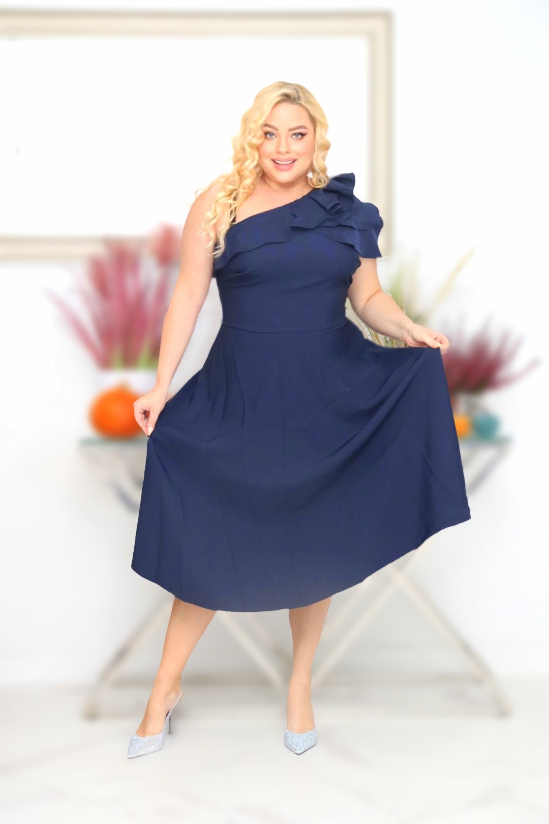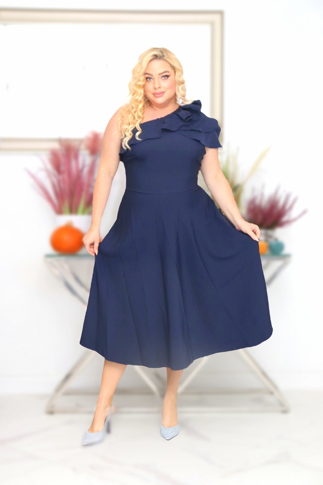 z rozkloszowanym dołem i eleganckim dekoltem z falbaną na jedno ramię.