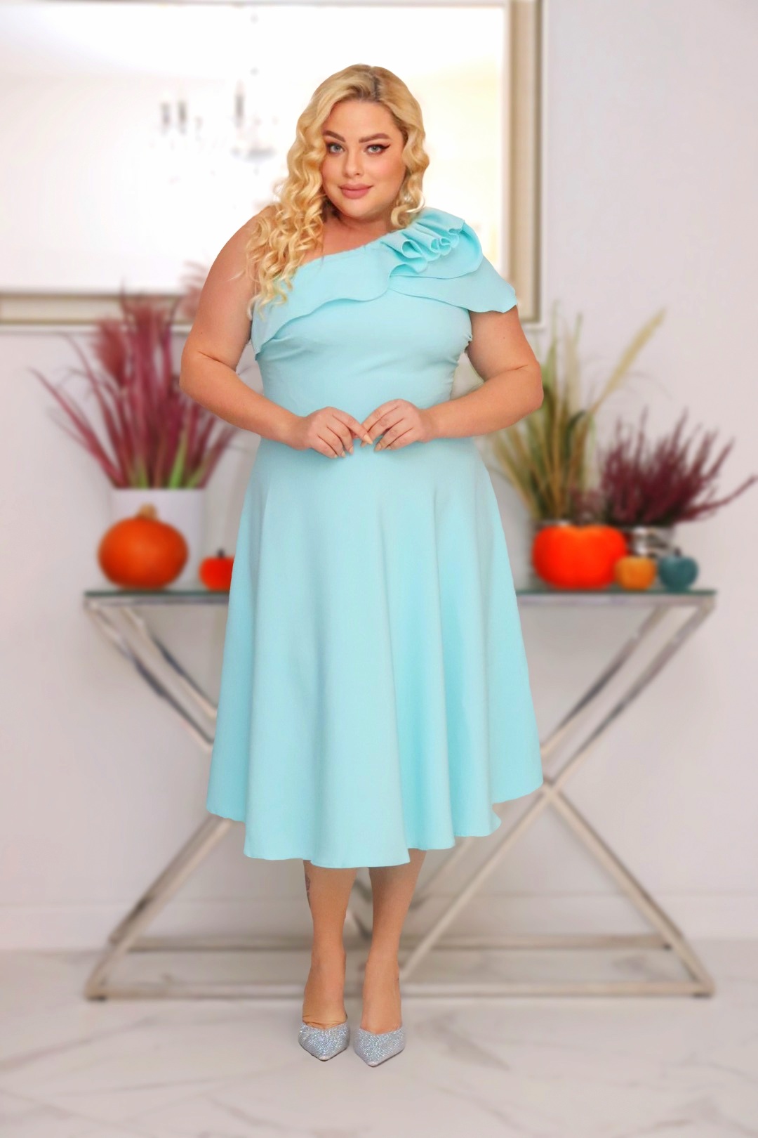 z rozkloszowanym dołem i eleganckim dekoltem z falbaną na jedno ramię.