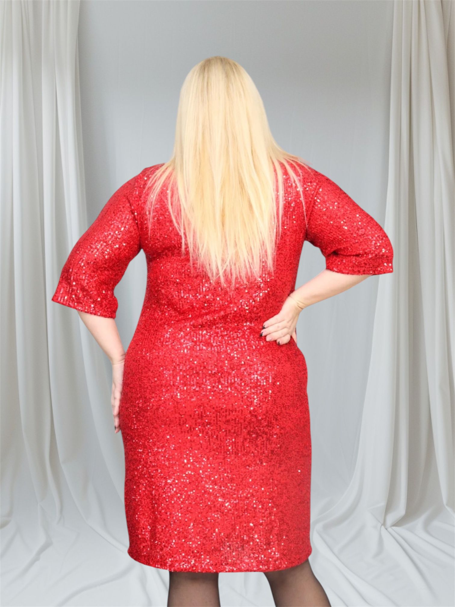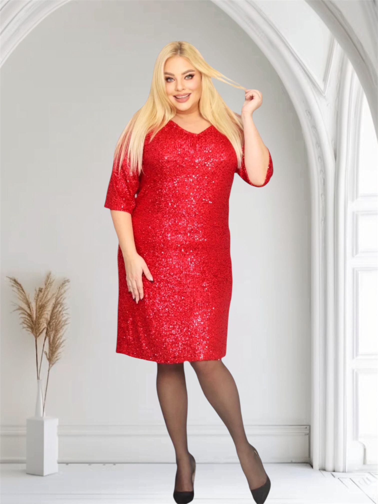 ? Blask, który przyciąga wzrok: Wysokiej jakości dzianina cekinowa pięknie pracuje w świetle, czyniąc tę sukienkę idealnym wyborem na wesela, bankiety i wieczorne wyjścia.