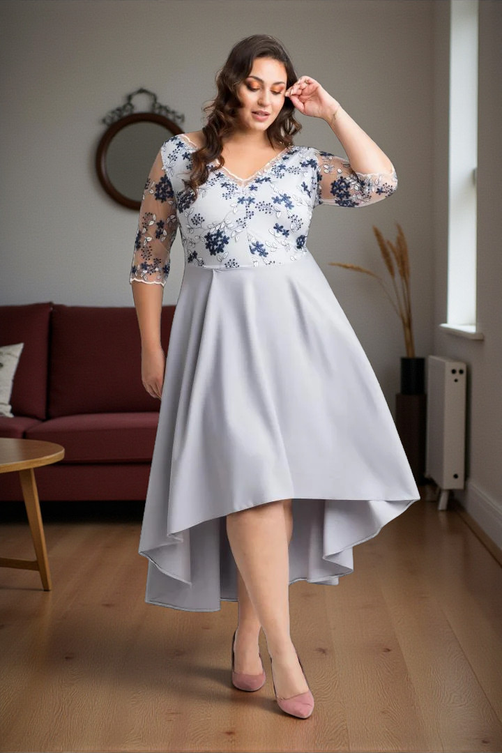 🇵🇱 Polski ProduktSukienka Fiorella asymetryczna rozkloszowana kopertowy dekolt koktajlowa koronka kwiatki granat popiel