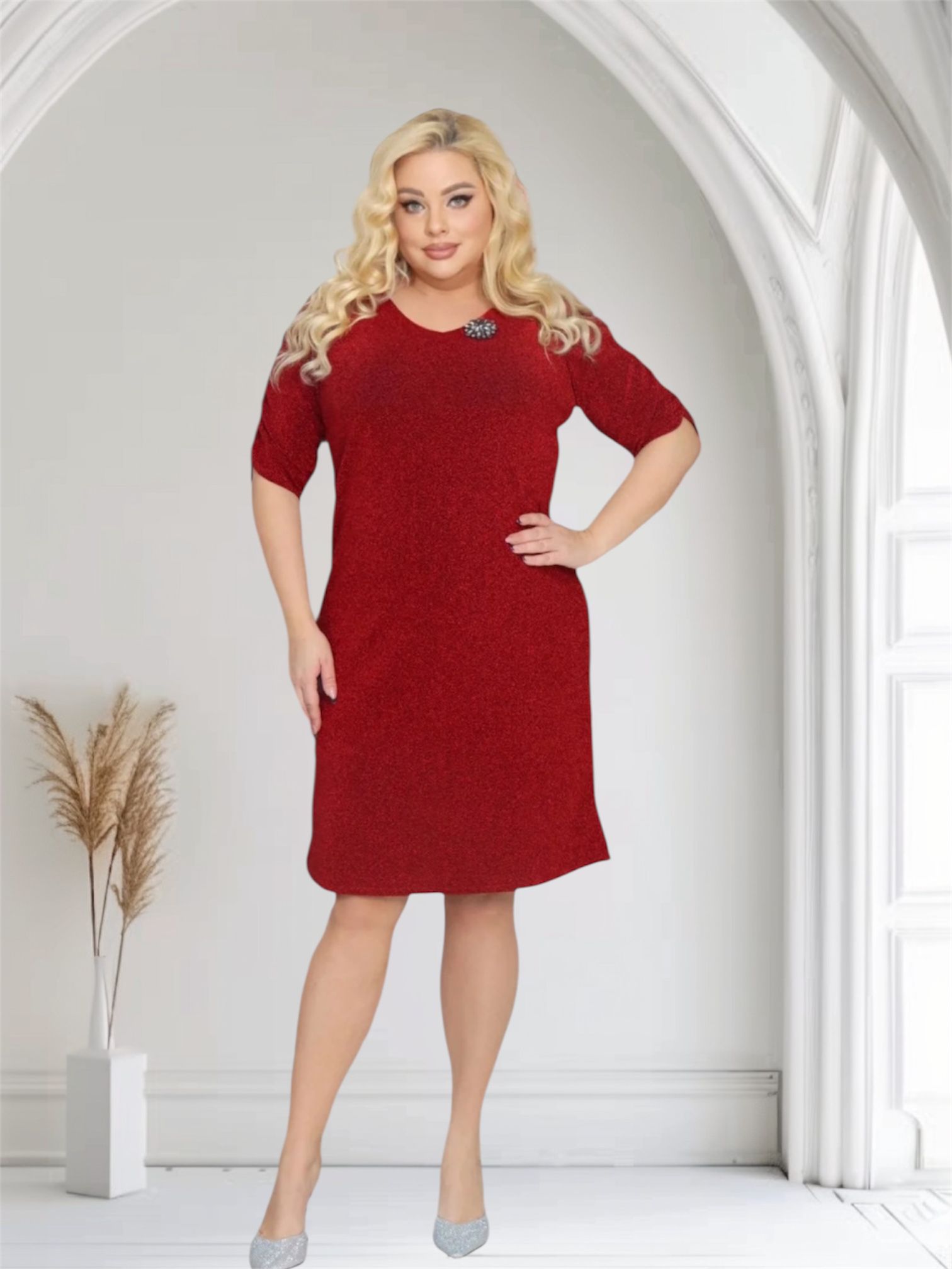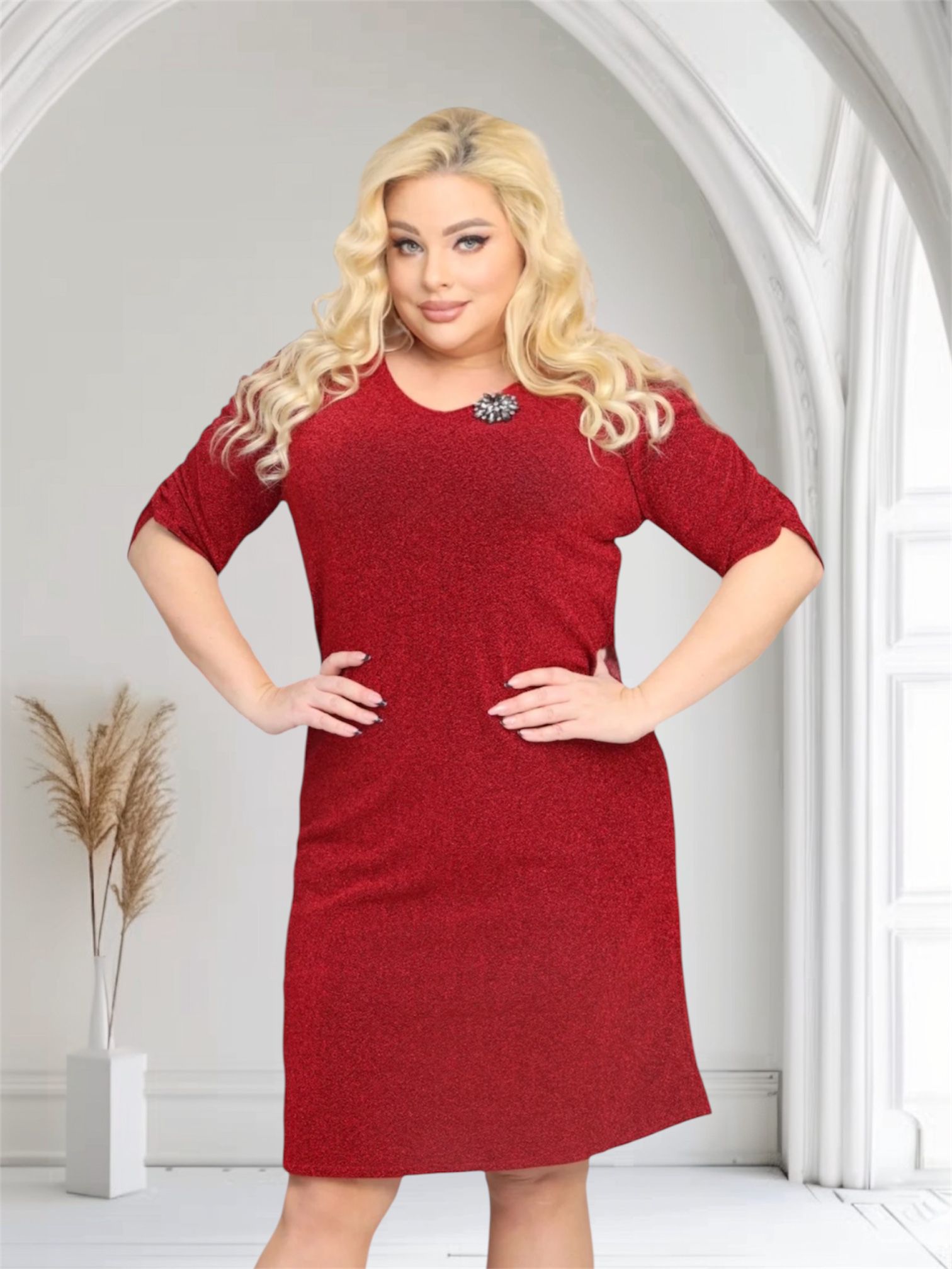 Sukienka z dzianiny brilliance w zestawie z broszką. Czerwona. KOD S1055.