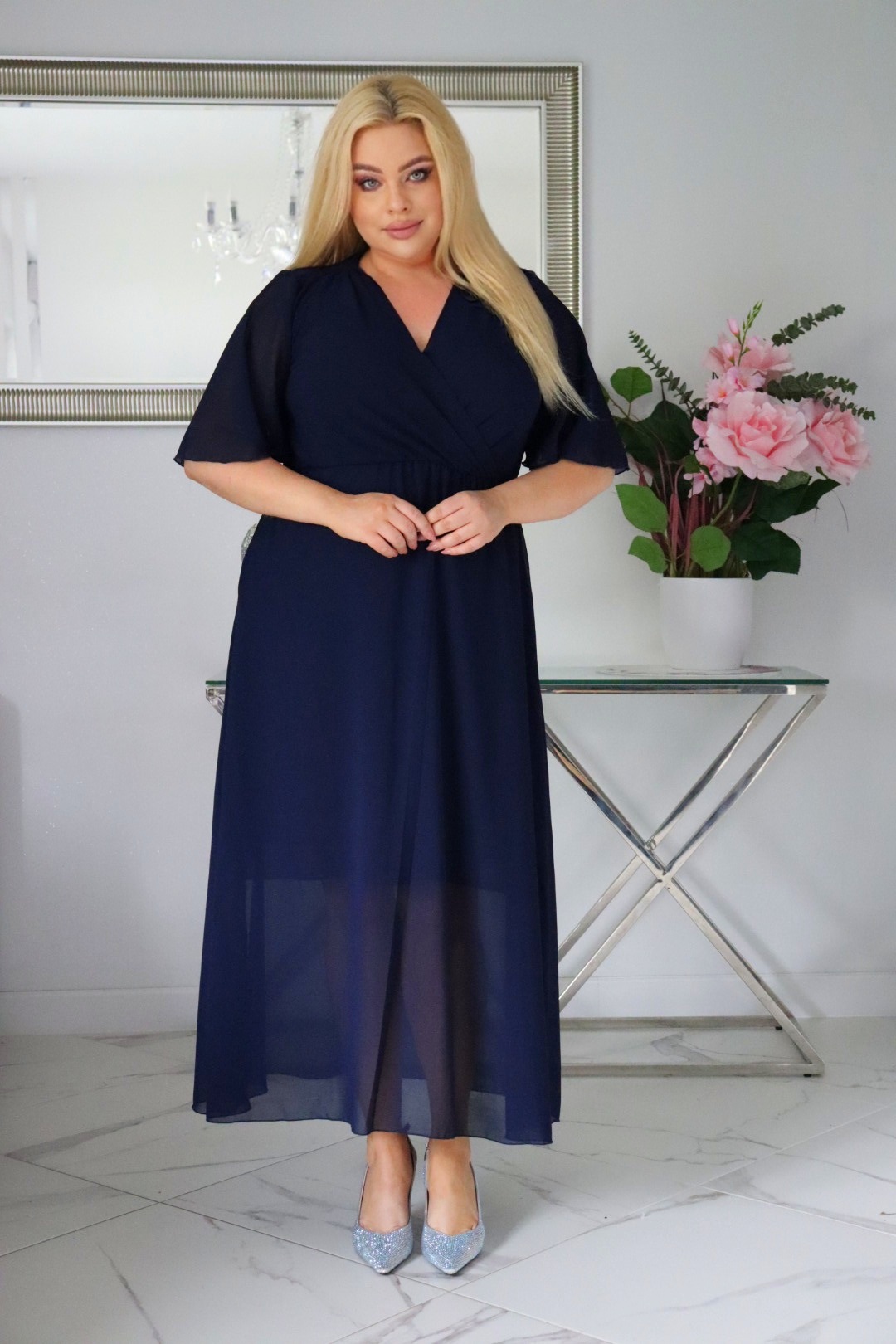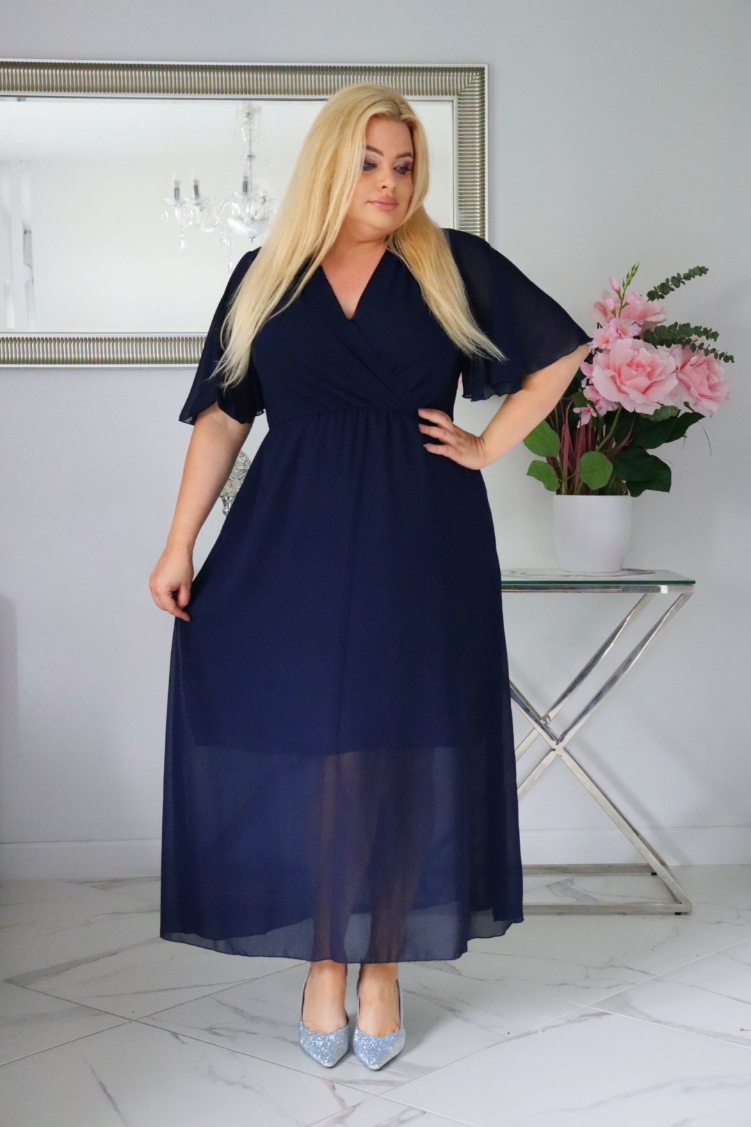 Sukienka MAXI trapezowa V-neck. Granatowa szyfonowa. KOD S1018.