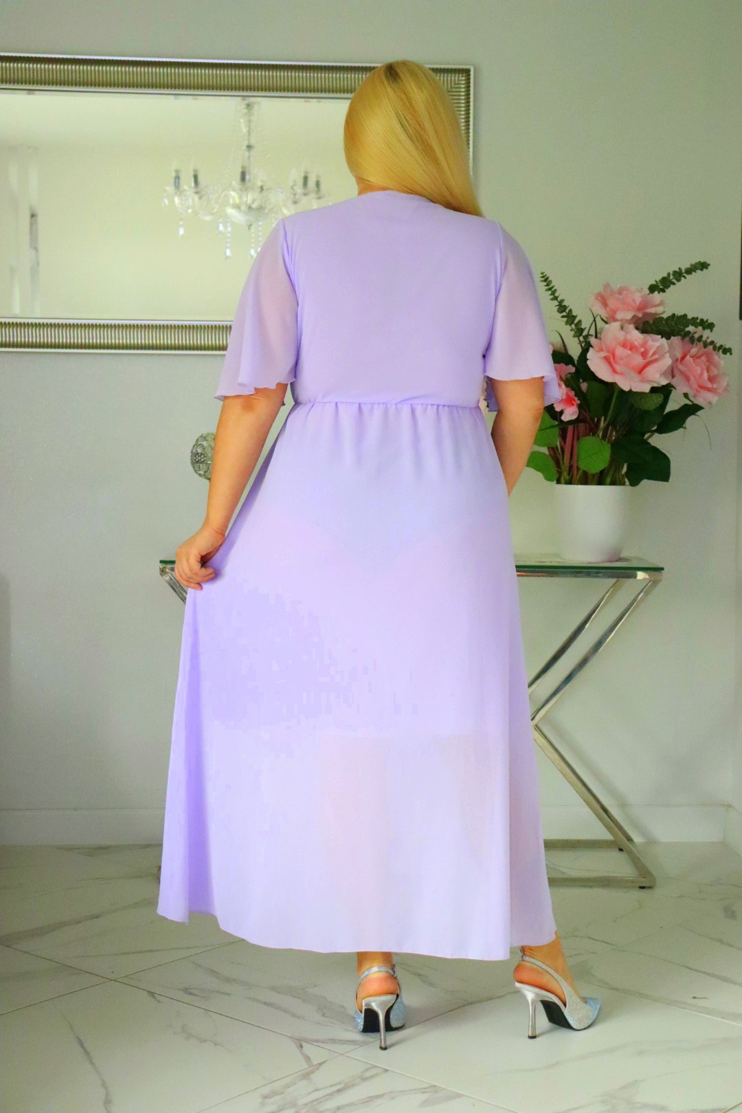 ⭐⭐⭐⭐⭐ 4.7Bestseller137+ sprzedanych!🇵🇱 Polski ProduktSukienka MAXI trapezowa Ariel z szyfonu żorżeta liliowa
