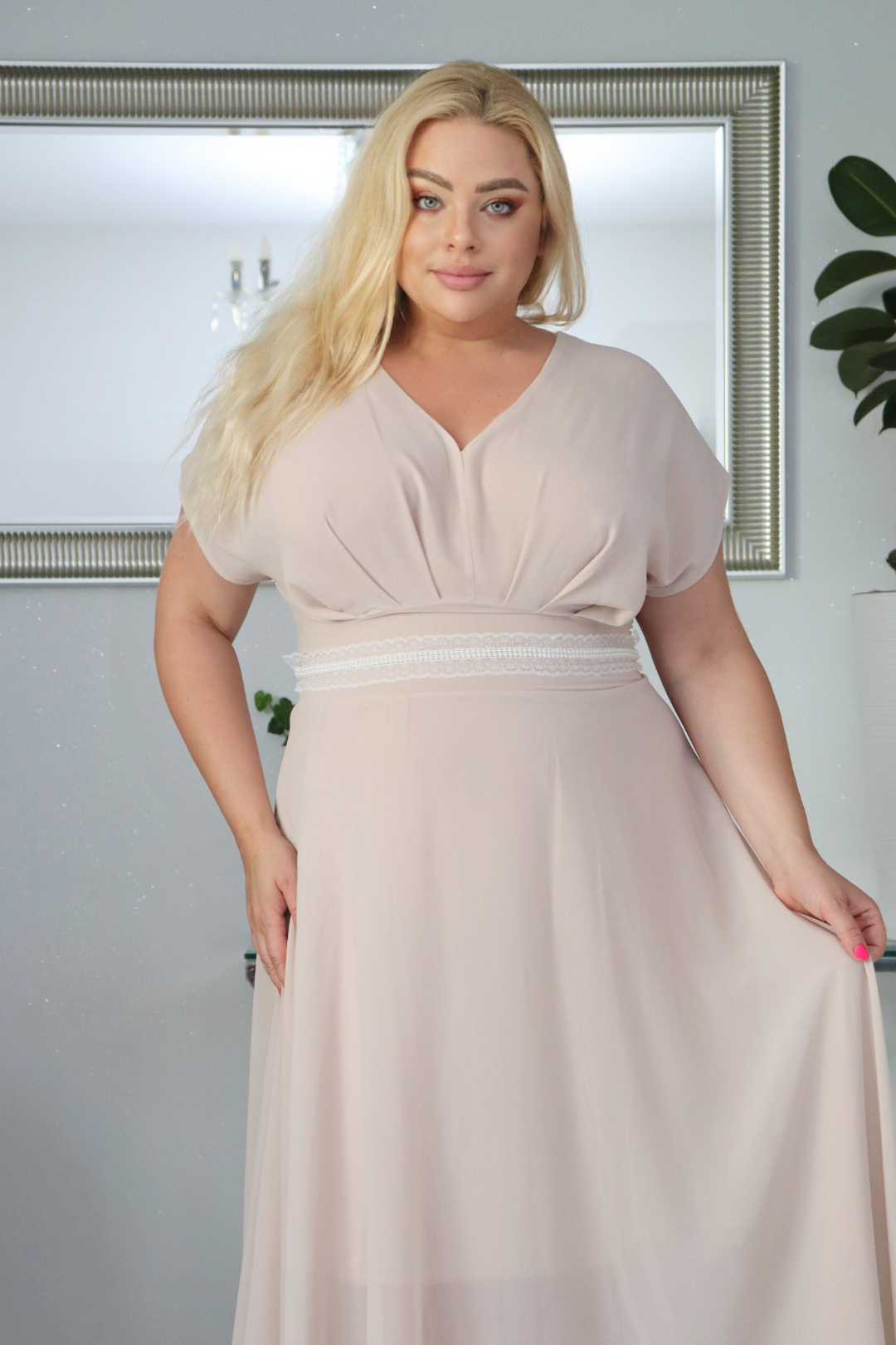 • Zmierz się dokładnie centymetrem krawieckim tuż pod biustem, tam gdzie biustonosz styka się z ciałem 📏. W tym miejscu znajduje się odcięcie sukienki, które ma największy wpływ na to, jak kreacja będzie się prezentować.