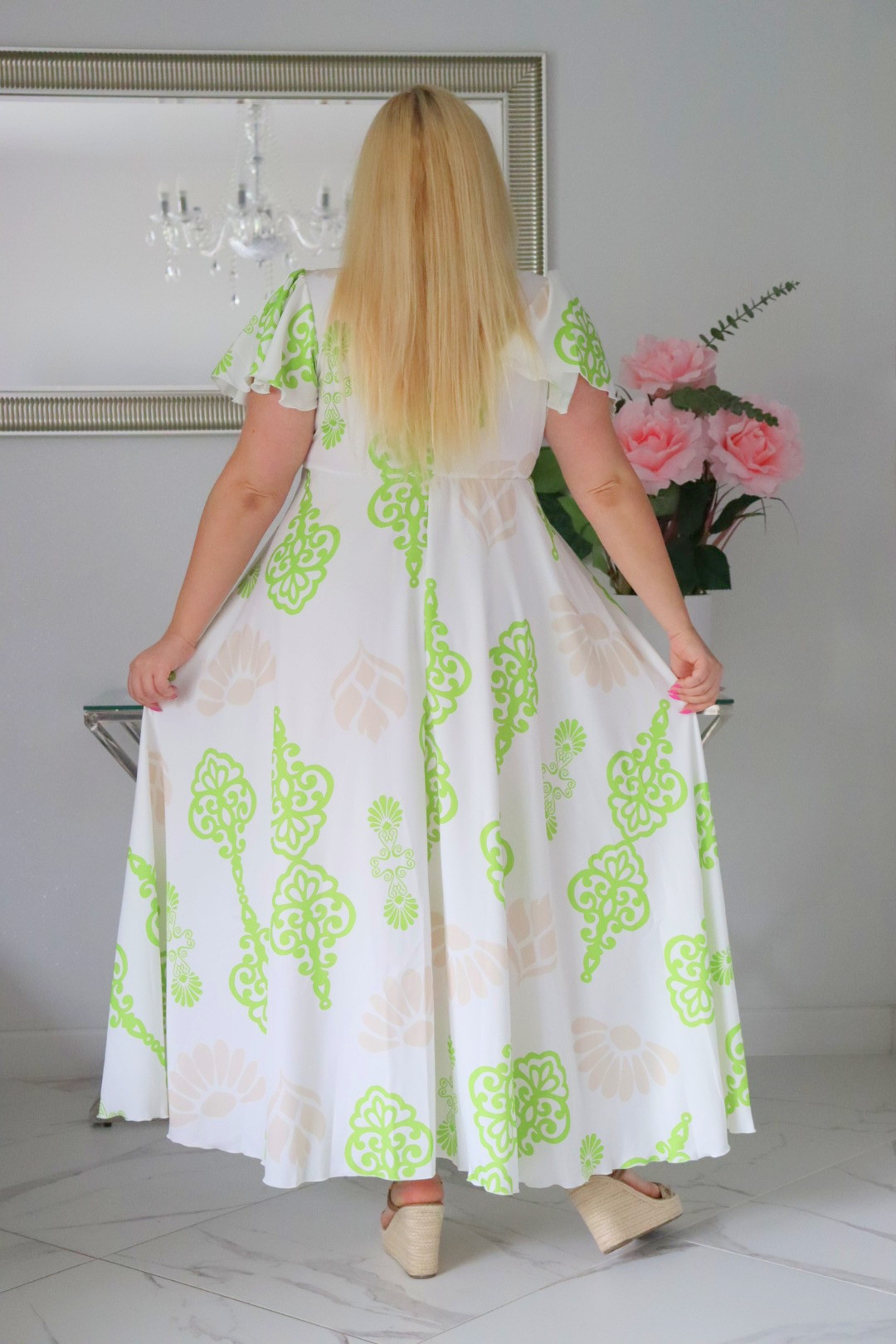 Sukienka rozkloszowana z kolekcji naturalny skład Royalty z limonką. V-neck. KOD S1022