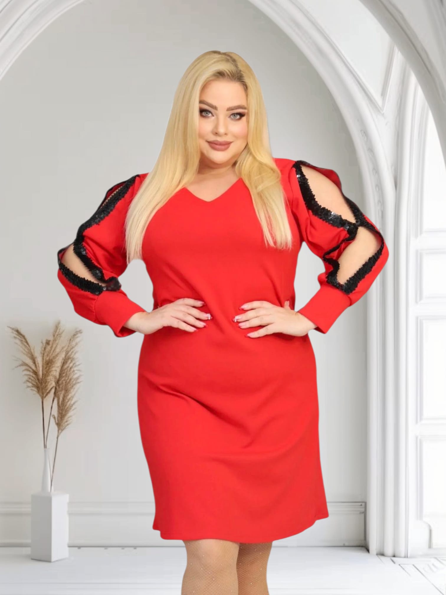 🇵🇱 Polski ProduktSukienka Noelia trapezowa rozcięte rękawy cekiny czerwona