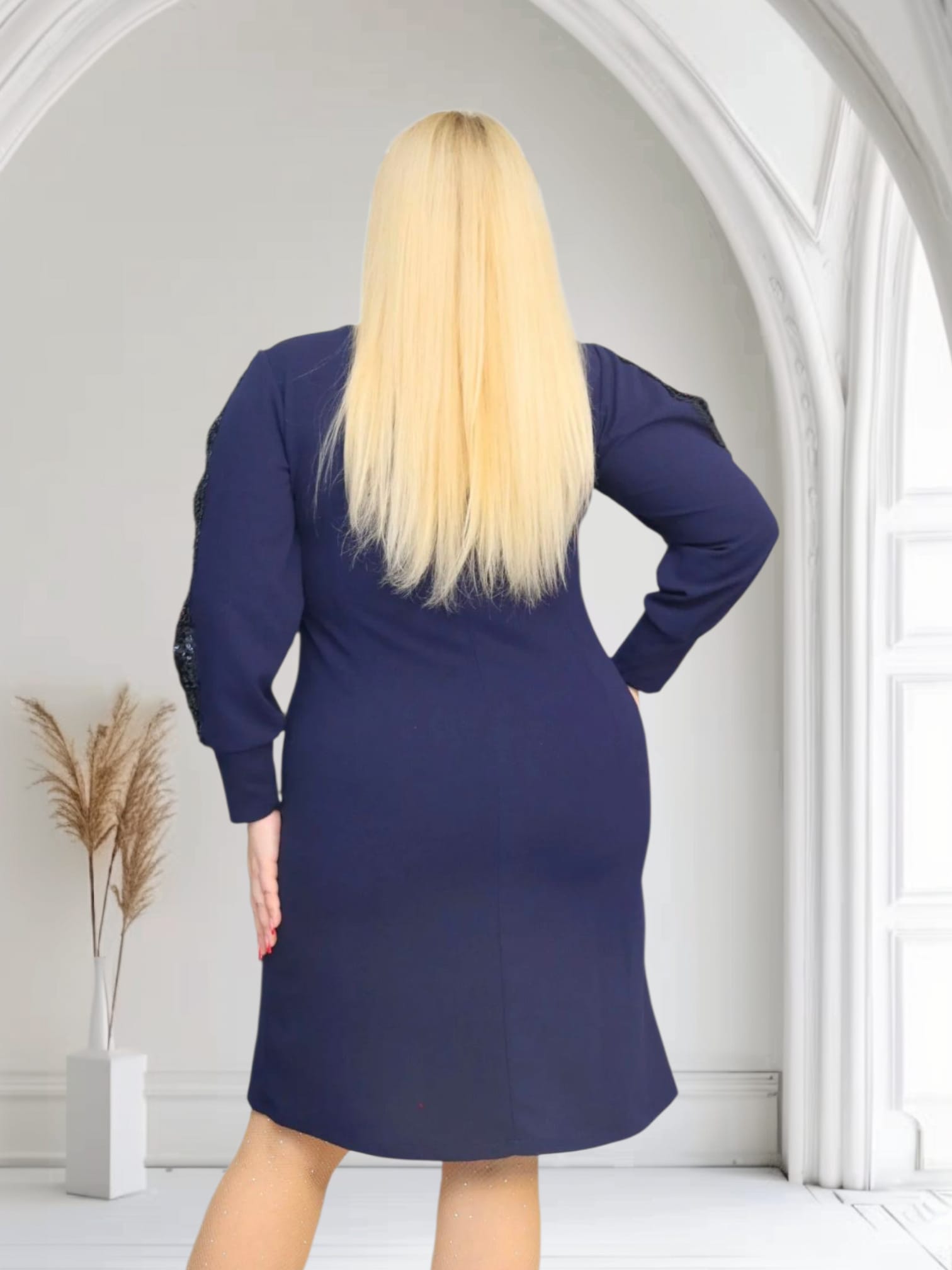 Rękawy sukienki są ozdobione cekinową taśmą.