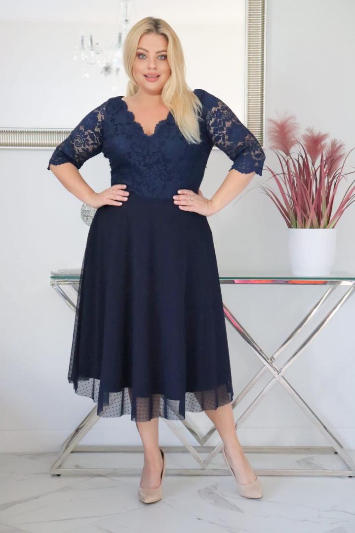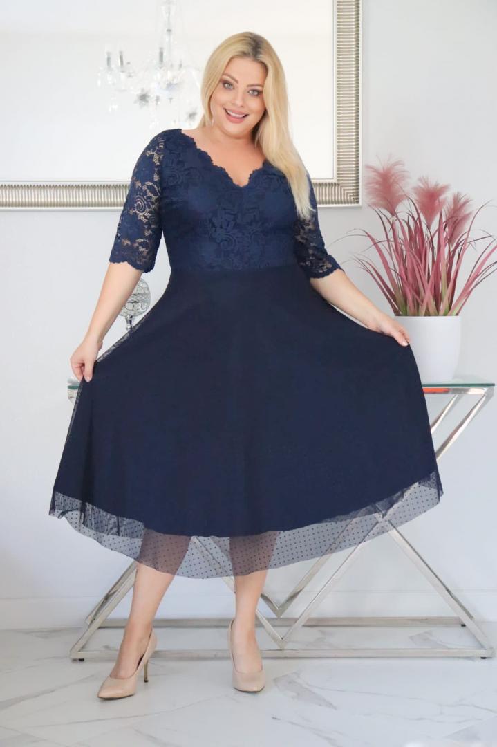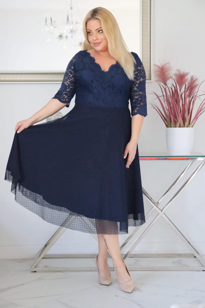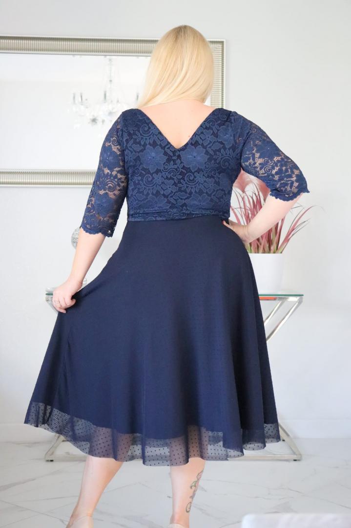 🇵🇱 Polski ProduktSukienka Pisla rozkloszowana elastyczna koronka koło z tiulu granatowa