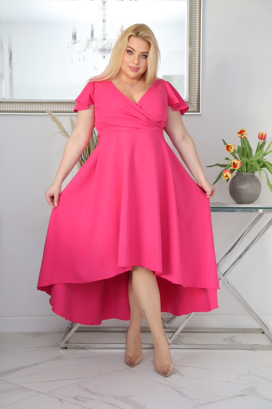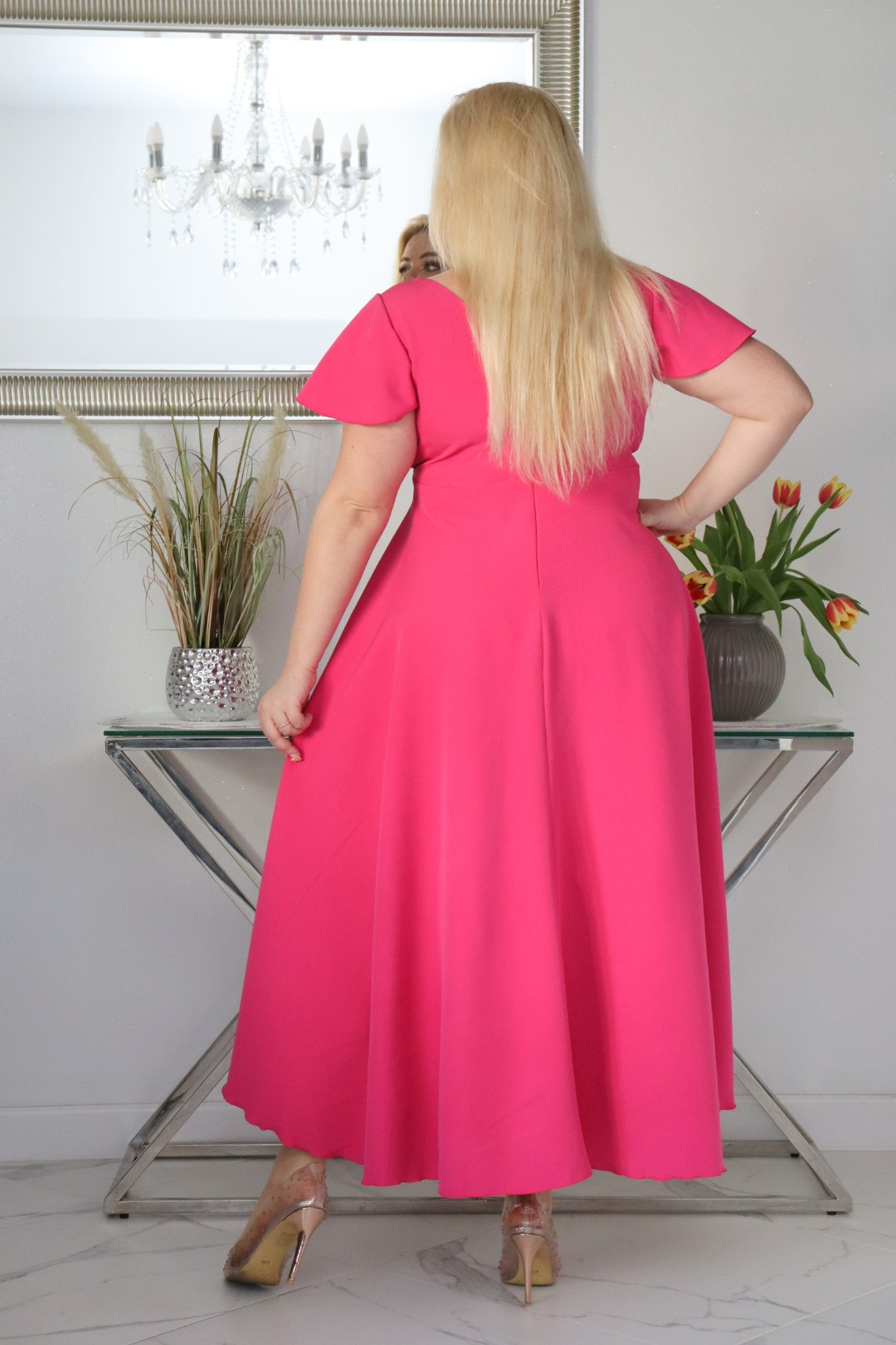 Sukienka idealnie zatuszuje wystający brzuszek. Dół sukienki jest rozkloszowany więc obwód bioder nie jest potrzebny.