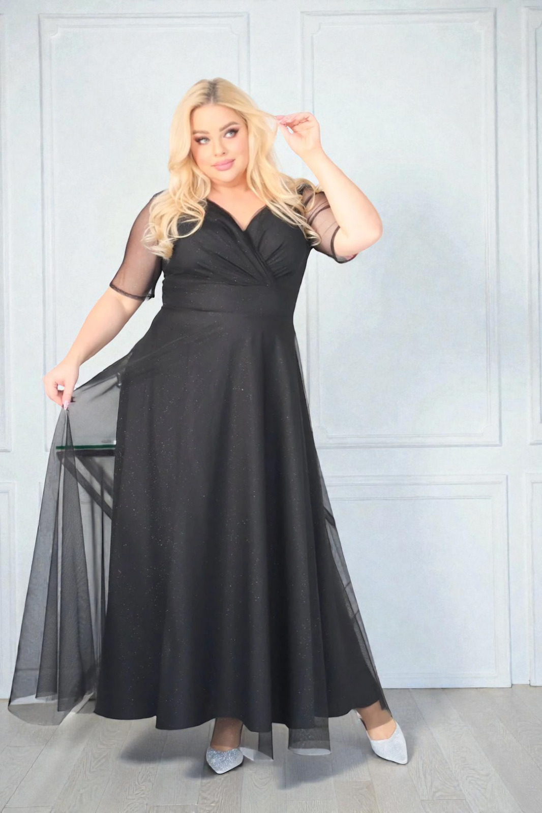 🇵🇱 Polski ProduktSukienka z brokatowym tiulem kopertowy dekolt czarna. A020.