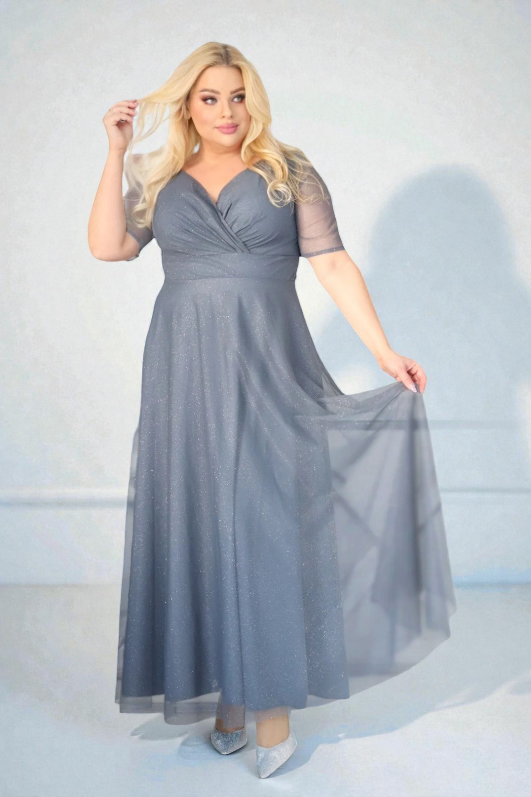 Sukienka z brokatowym tiulem kopertowy dekolt A020 grafitowa