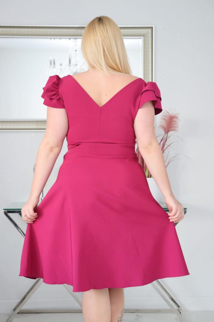 - Sekretne powiększenie dekoltu. Dekolt w kształcie litery V, ułożony z delikatnych zakładek, jest genialnym trikiem, który optycznie wydłuża szyję i sprawia, że biust wygląda zjawiskowo. To prosty, ale niezwykle efektowny detal, który dodaje pewności siebie i pozwala czuć się pięknie. W tej sukience nie musisz się martwić, że wyglądasz zwyczajnie – ona podkreśla Twoją kobiecość w najbardziej subtelny sposób.