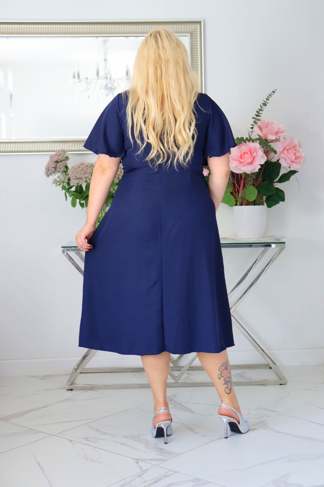 Sukienka z biżuteryjną klamrą – natychmiastowy Look Premium! Granatowa. KOD S1013